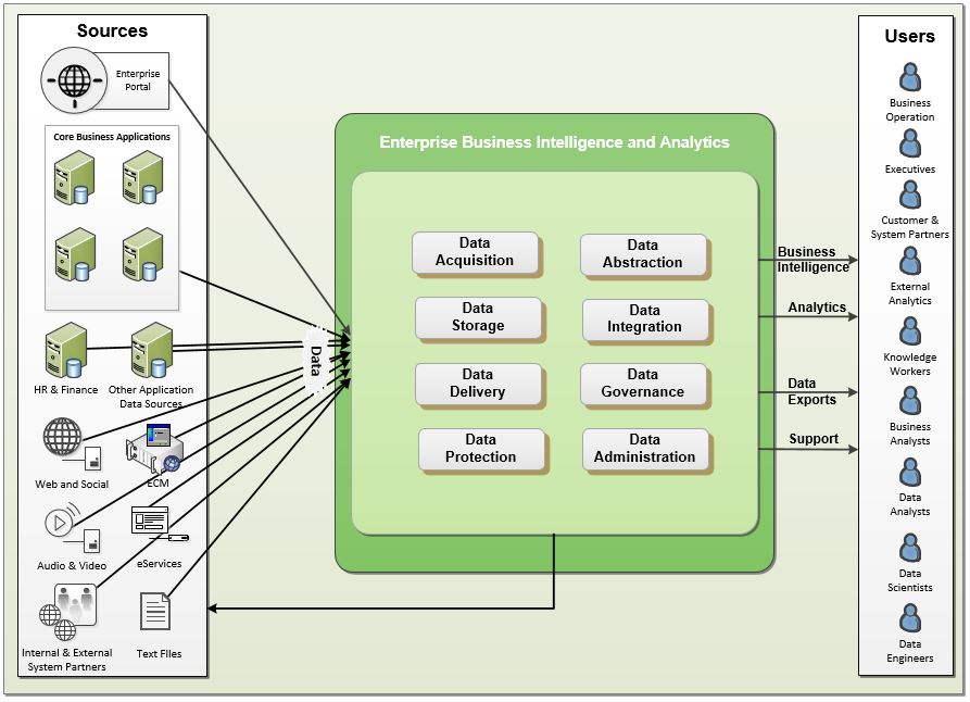 MZM BI & analytics architecture is comprised of five capabilities: Data Acquisition, Data Integration, Data Storage, Data Abstraction and Data Presentation. It's capabilities promote separation of concerns between the way information is acquired, managed, and the way it is accessed. It allows information to be managed holistically while enabling access to appropriate users via the best means possible. These capabilities satisfy any BI or Analytics request including management reporting, predictive analytics, dashboards, modelling, forecasting, visualizations, trending, etc.